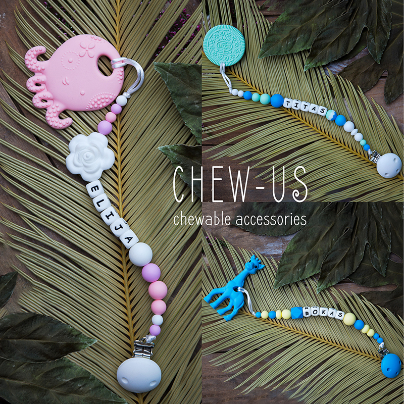 CHEW-US tai stilingi papuošalai, aksesuarai, kramtukai ir čiulptukų laikikliai iš saugaus vaikams silikono. Mūsų išskirtinis bruožas – vardiniai čiulptukų laikikliai ir kramtukai, kuriuos sukuriame individualiai pagal kiekvieno kliento pageidavimą. Tokiu būdu Jūs galite padovanoti savo vaikui asmenišką, tik jam skirtą dovaną.