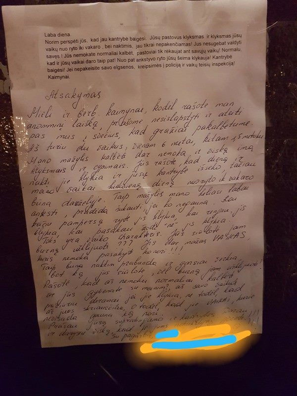 Socialiniuose tinkluose plinta nuotrauka, kurioje nufotografuotas daugiabučio laiptinėje pakabintas raštelis kaimynams su ranka prirašytu kaimynės atsakymu į jį. Dauguma internautų pasibaisėję, kad dėl vaikų keliamo triukšmo kaimynai grasina Vaikų teisėmis.