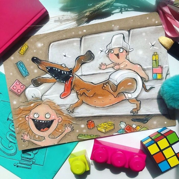 Maria Gorbunova augina du vaikus, ir jei to nepakanka, ji laikas nuo laiko įamžina savo chaotišką kasdienį gyvenimą. Nesvarbu, ar tai bemiege naktis, ar sunkus skrydis, jos iliustracijose visa tai perteikiama realistiškai ir humoro jausmu. Jei esate jaunieji tėveliai, tai tikėtina, kad jums patiks ir Marijos menas.