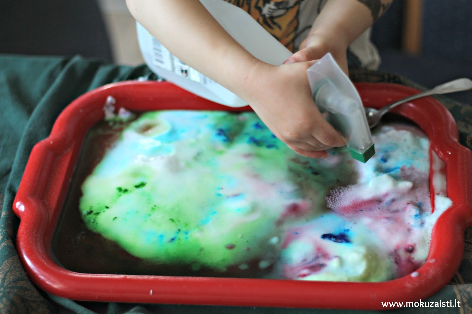 bandymą su pienu. Jie tikrai nesudėtingi, įdomūs, paprasti, saugūs ir tinkami nuo kokių dvejų metų. Dabar, kai Kasparas jau paaugęs (3m.8mėn.), smagu išbandyti kažką sudėtingesnio, kur reikia daugiau susikaupimo ir atsargumo. Prisiminti eksperimentus mane įkvėpė vienos šeimos bandymai su sausuoju ledu (