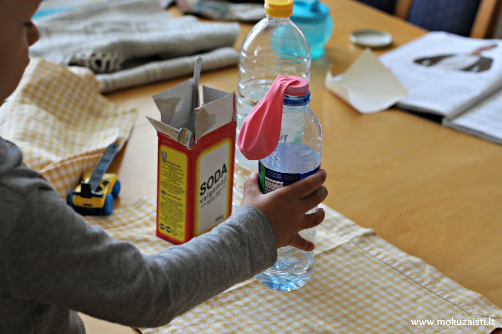 čia. Kai jau viską suruošite, užmaukite balioną ant butelio, laikydami balioną suspaudę taip, kad soda neišbyrėtų. Balioną iškelkite aukštyn virš butelio ir atleiskite ranką, kad visa soda subyrėtų į butelį. Susimaišius medžiagoms, balionas ims pūstis. Abejoju, ar vaikai apsiribos vienu tokiu bandymu, todėl galite paeksperimentuoti su kiekiais.