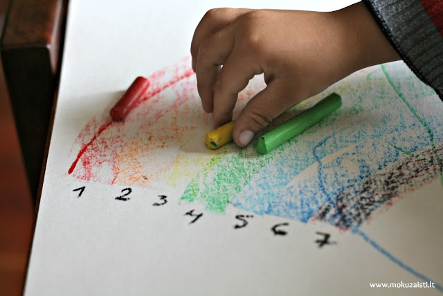 Pradžioje, Kasparas spalvų pavadinimus sakydavo angliškai. Gyvenome ne Lietuvoje, o pripažinkime, kad lietuviški spalvų pavadinimai gerokai sunkesni. Nors jau kurį laiką anglų kalbos negirdi, tas angliškas spalvas pamena iki šiol. O aš nepaliauju žavėtis dar ir tuo, kad su vaiku užtenka kelis kartus ką nors padaryti, pavyzdžiui, sugrupuoti skirtingus daiktus pagal spalvas, o jis tai atsimena ir paskui pats susikuria netikėčiausių žaidimų. Praėjusį kartą, kai piešėme ir guašu, ir akvarele, Kasparas (3m.) sudėliojo guašo buteliukus ant akvarelės pagal spalvas. „Va taip turi būti“ – pasakė man.
