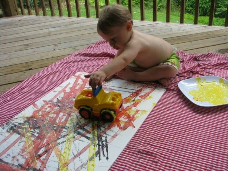 Labiau vasarnamio variantas, bet tai labai linksma – duokite įvairių dažų, mašinėlių su skirtingais ratais ir pan….