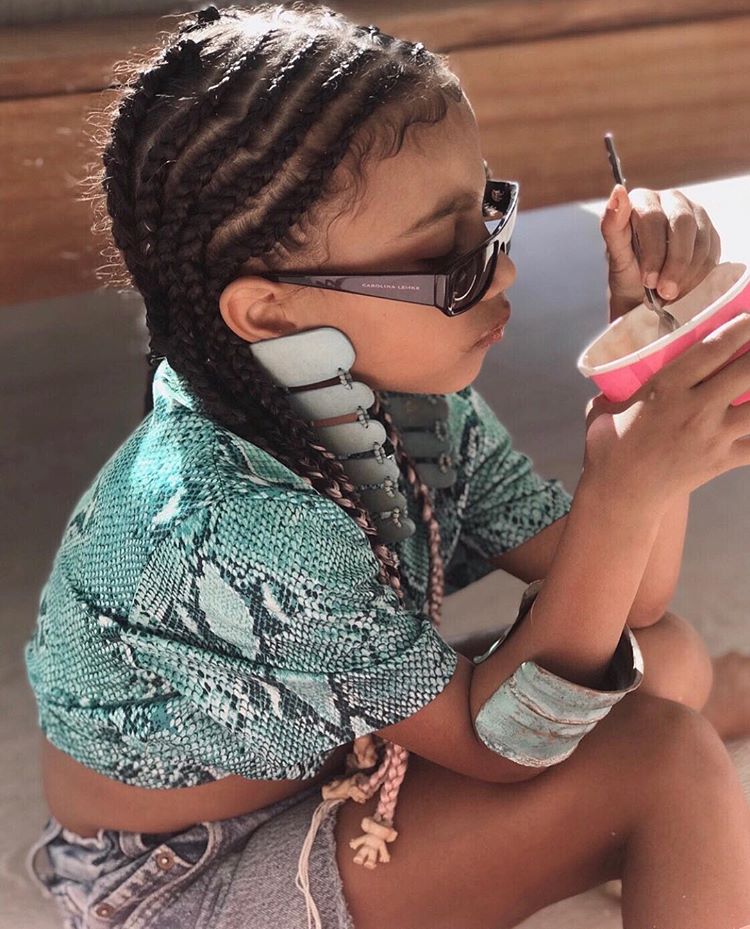 Fotografijoje mažoji North įamžinta valganti ledus, dėvinti gyvatės rašto palaidinę ir džinsinius šortus. Prie jų mergaitė priderino gerokai per didelius mamos auskarus ir vardinius „Carolina Lenke“ akinius nuo saulės.