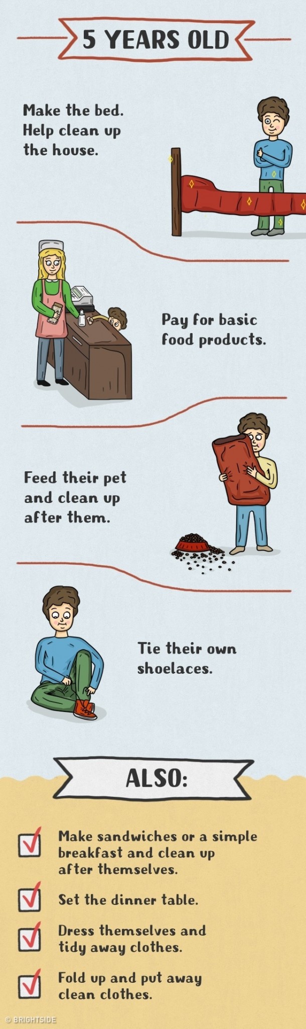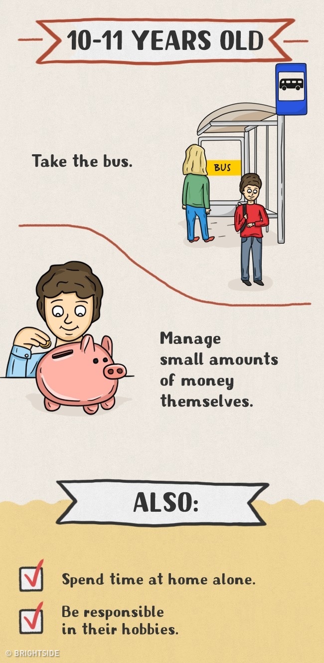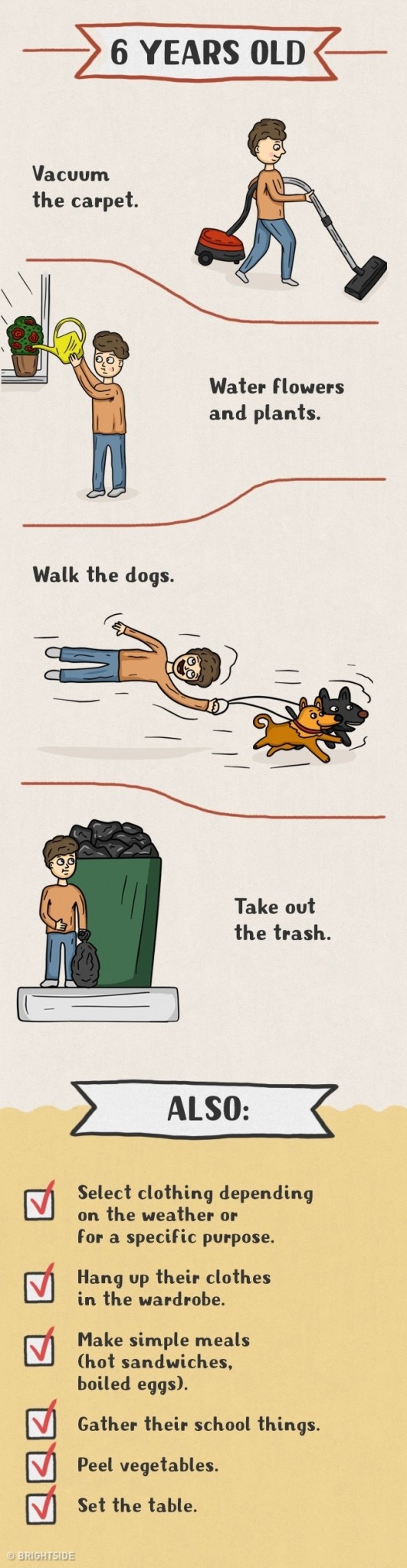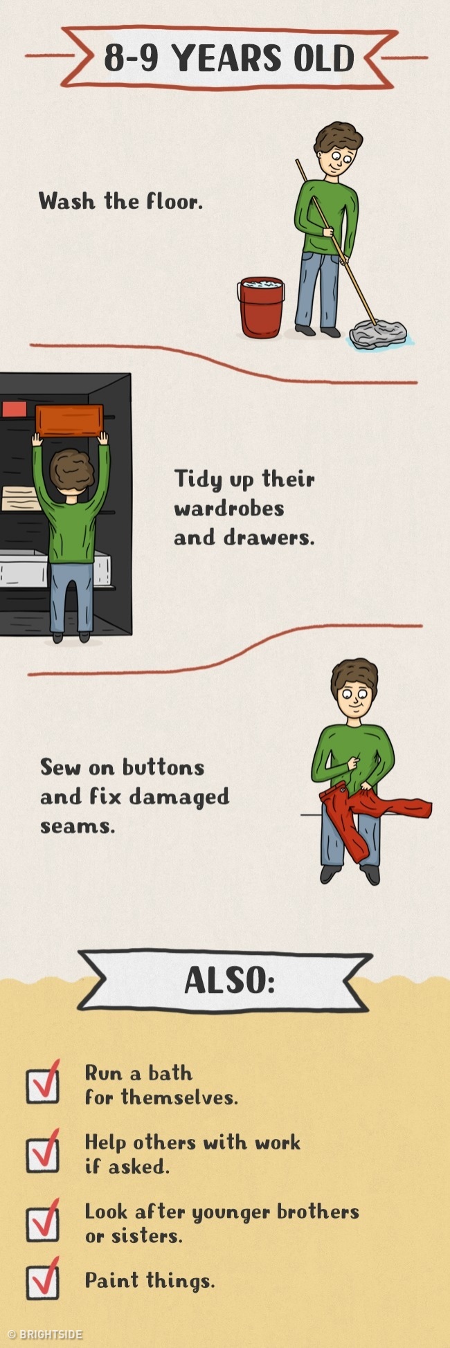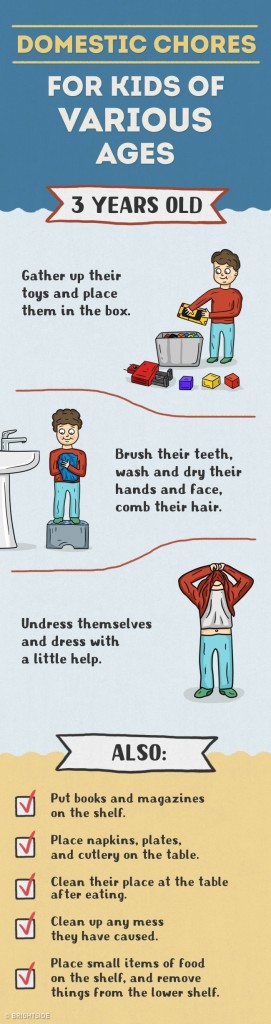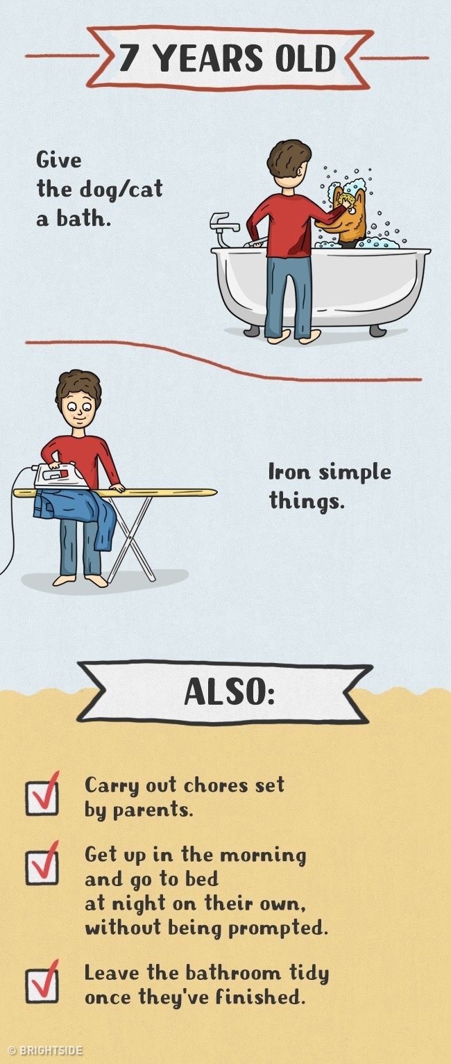 Daugelis tėvų tiesiog vengia vaikus įtraukti į namų ruošos darbus ir daro didelę klaidą. Pagalba tėvams yra vaikams ne tik prievolė, bet ir džiaugsmas bei galimybė jaustis pilnaverčiu, reikalingu. Taip jie išmoksta atsakomybės, įgauna ateityje reikalingus įgūdžius, jaučiasi nepriklausomi ir savarankiški. Štai piešinėliai, kuriuose pavaizduota, ką turi mokėti skirtingo amžiaus vaikai: