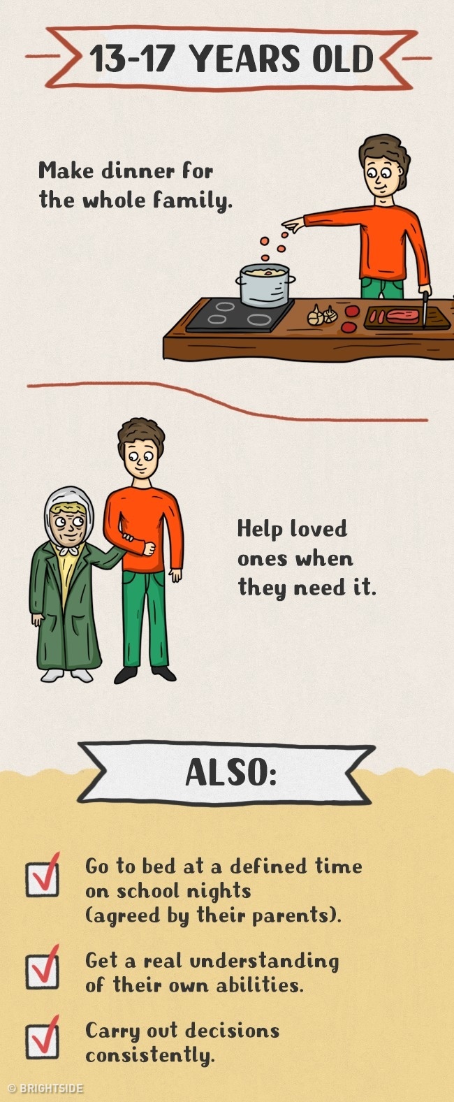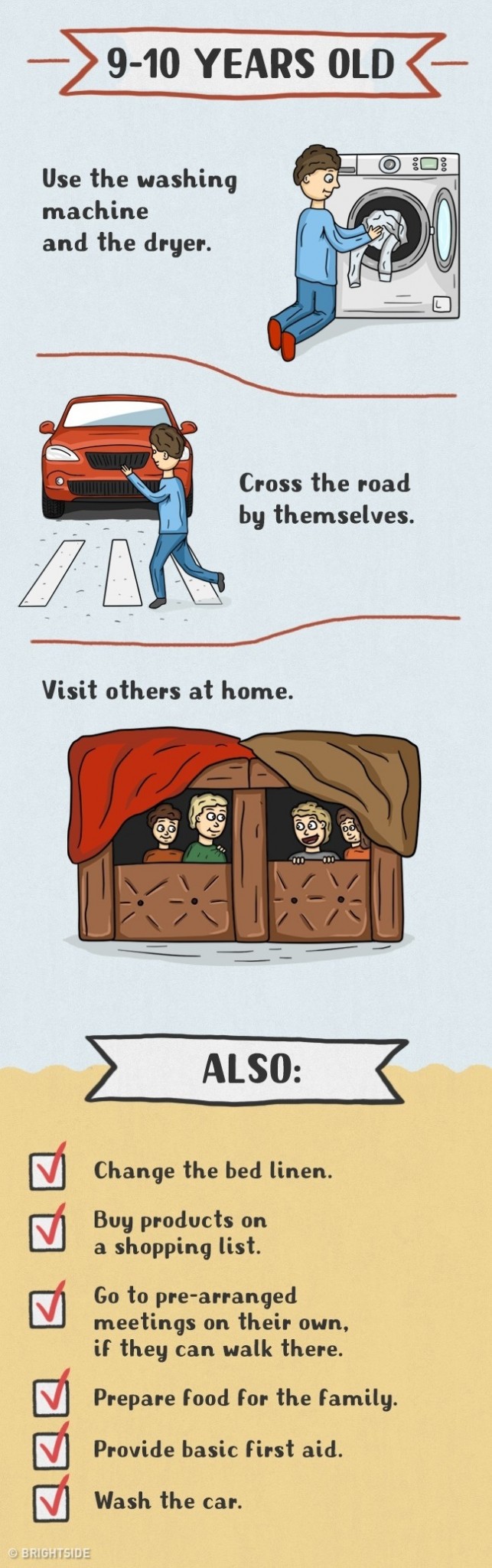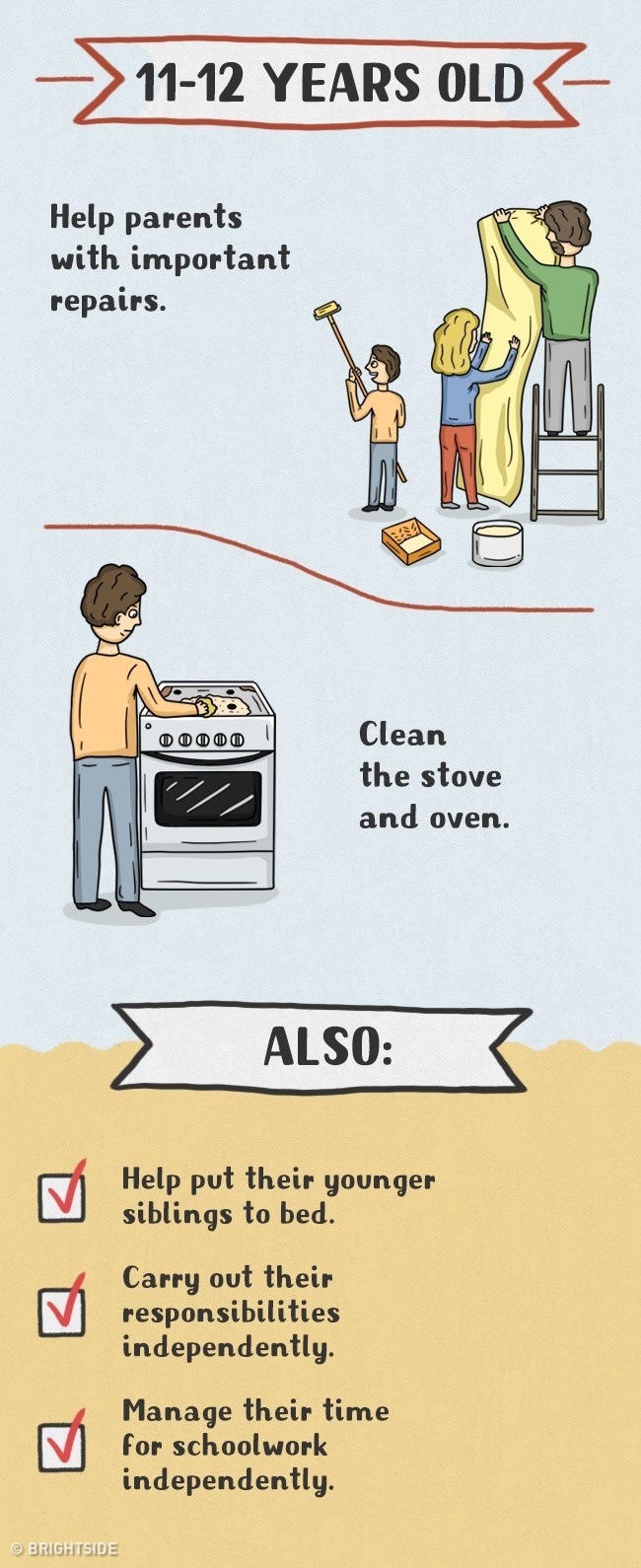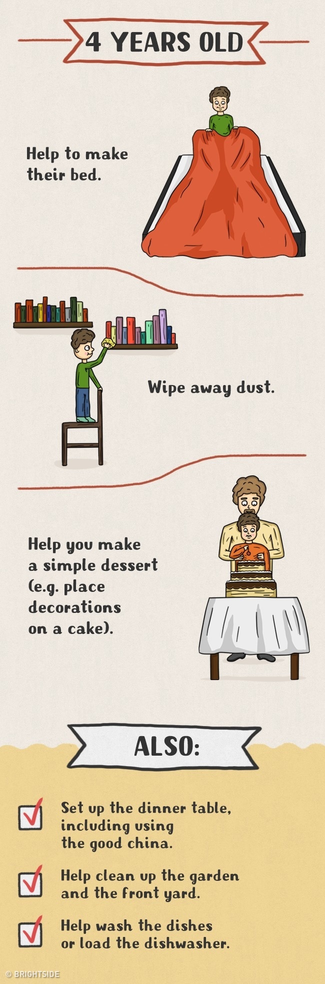 Daugelis tėvų tiesiog vengia vaikus įtraukti į namų ruošos darbus ir daro didelę klaidą. Pagalba tėvams yra vaikams ne tik prievolė, bet ir džiaugsmas bei galimybė jaustis pilnaverčiu, reikalingu. Taip jie išmoksta atsakomybės, įgauna ateityje reikalingus įgūdžius, jaučiasi nepriklausomi ir savarankiški. Štai piešinėliai, kuriuose pavaizduota, ką turi mokėti skirtingo amžiaus vaikai:
