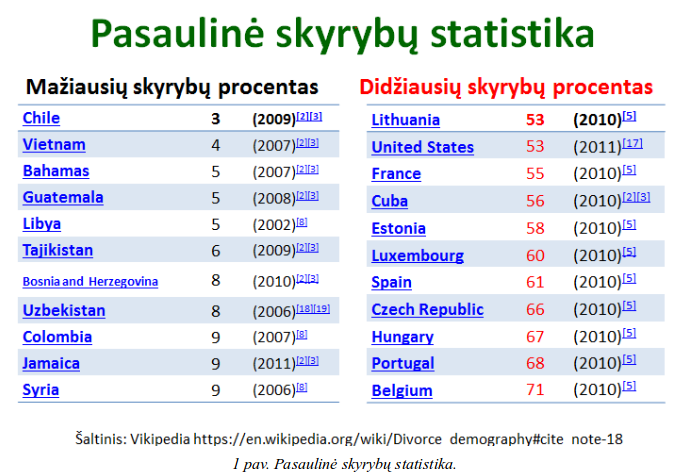 Necivilizuotuose kraštuose (tose šalyse, kuriose moteris nėra lygi vyrui), skyrybų yra žymiai mažiau (žiūr. 1 pav.). Tačiau ar tai reiškia, kad žmonos tuose kraštuose yra laimingos ir todėl nesiskiria?