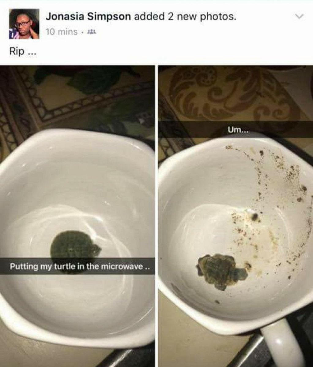 15-metė iš Bostono, vardu Jonasia Simpson, sulaukė daugybės grasinančių žinučių po to, kai savo socialinio tinklo „Facebook“ paskyroje pasidalijo šokiruojančiu savo poelgiu ir tai įrodančiomis nuotraukomis. Paauglė sugalvojo įdėti savo augintinį vėžlį į mikrobangų krosnelę.