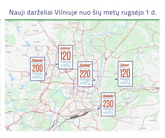 Per 2015 m. pavyko laukiančiųjų eilę sumažinti apie 2 000 vietų (1 440 atsirado įvedus 100 Eur kompensaciją ir dar 560 naujų vietų įsteigta optimaliai išnaudojant turimas darželių patalpas). Nuo rudens bus sukurta papildomai apie 900 naujų vietų pritaikius darželiams remontuotinas savivaldybės patalpas: renovuojamas „Gluosnis“ (Justiniškėse), „Malūnėlis“ (Senamiestyje), „Ąžuolas“ (Žirmūnuose), „Kodėlčiukas“ (Šeškinėje) ir „Žolynas“ (Antakalnyje).