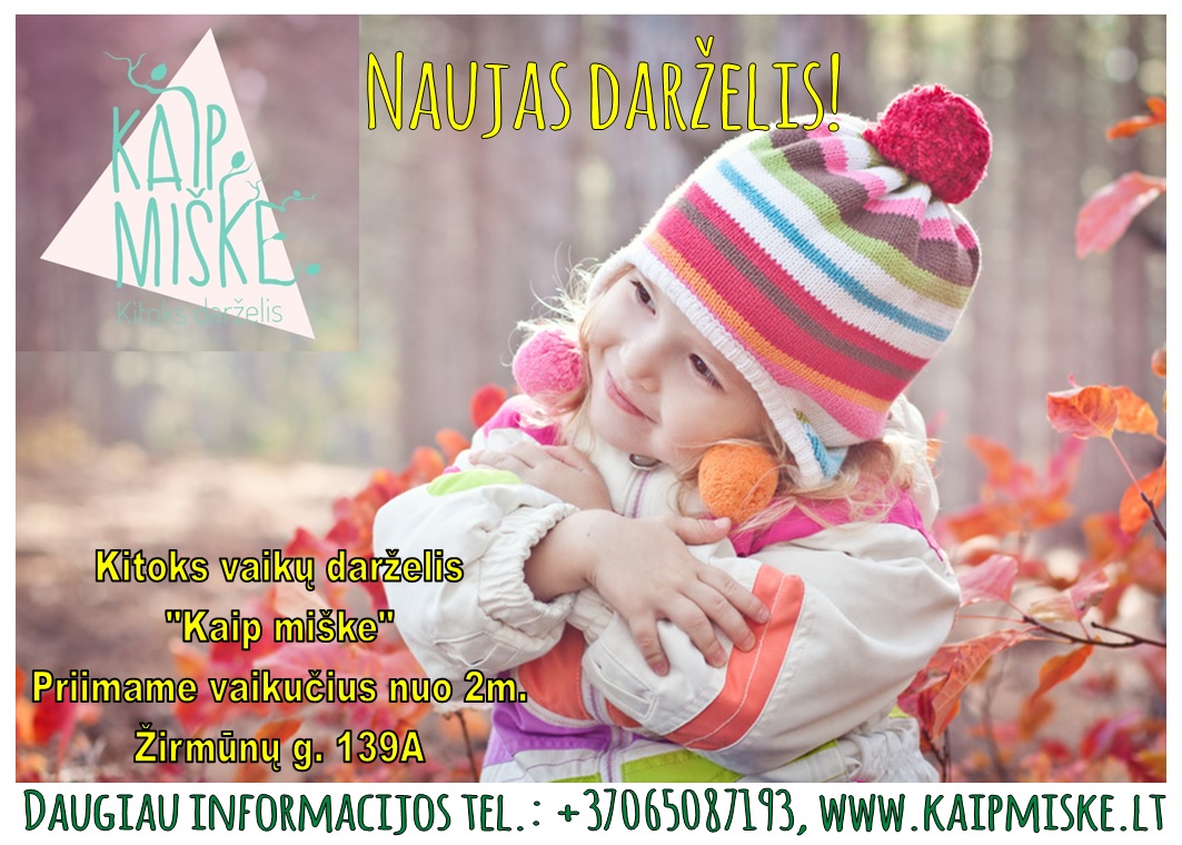 Darželis „Kaip miške“ kviečia į atvirų durų dienas! Renkame naujas vaikučių grupes naujame darželyje Žirmūnuose! Darželis „Kaip miške“ tai sutalpinta ilgametė patirtis dirbant su vaikais, beribė fantazija ir nuoširdus atsidavimas darbui. Daugiau informacijos www.kaipmiske.lt tel.: +37066292086 arba +37065087193