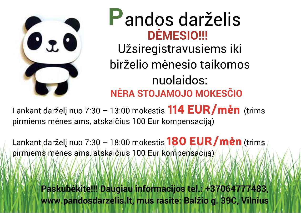 Mieli tėveliai, paskubėkite registruoti savo vaikučius į naujai atidaromą Pandos darželį, kadangi iki birželio 1 d. nėra stojamojo mokesčio bei taikomos nuolaidos.