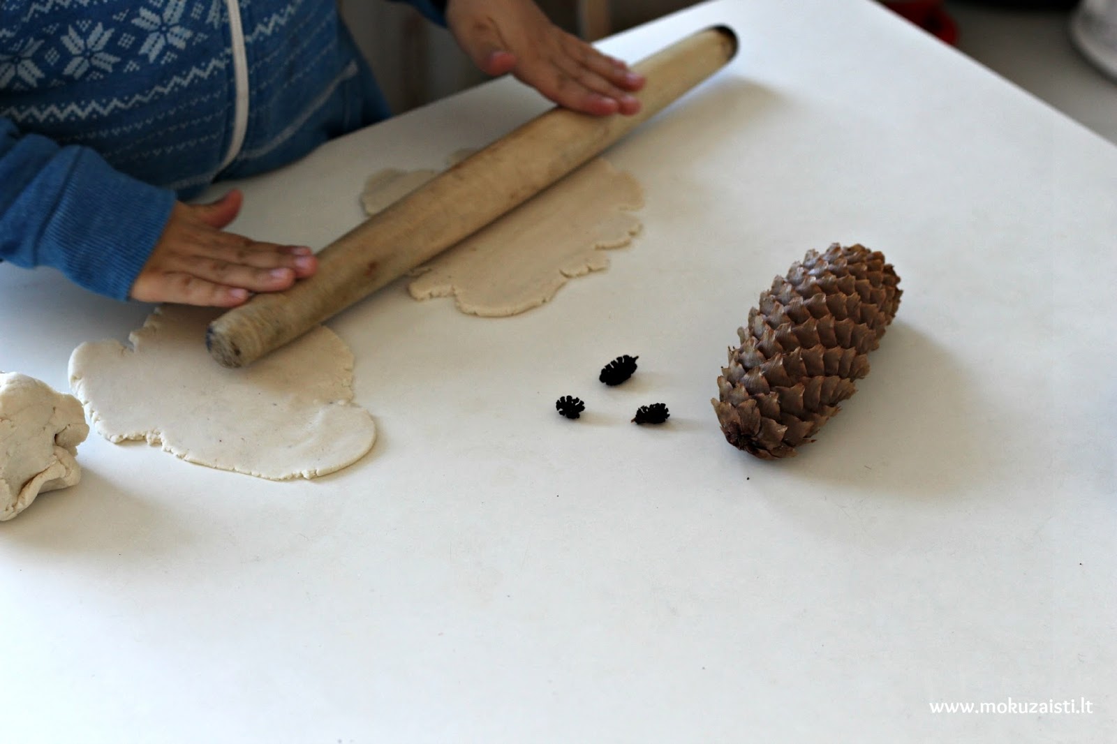 - Kankorėžių antspaudai. Plastilinas yra mano mėgstama priemonė (naminio receptas čia). Šįkart jį sugrupavau su kankorėžiais. Įvairių daiktų įspaudus mes jau esame tyrinėję, todėl Kasparas pats šiam užsiėmimui viską paruošė ir išbandė. Tiesa, galiausiai viskas virto laisvu, kūrybišku žaidimu.