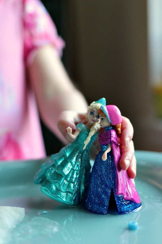 Į vieną iš indelių sudėkite karoliukus ir žaislinę figūrėlę, užpilkite šaltu vandeniu ir sušaldykite.